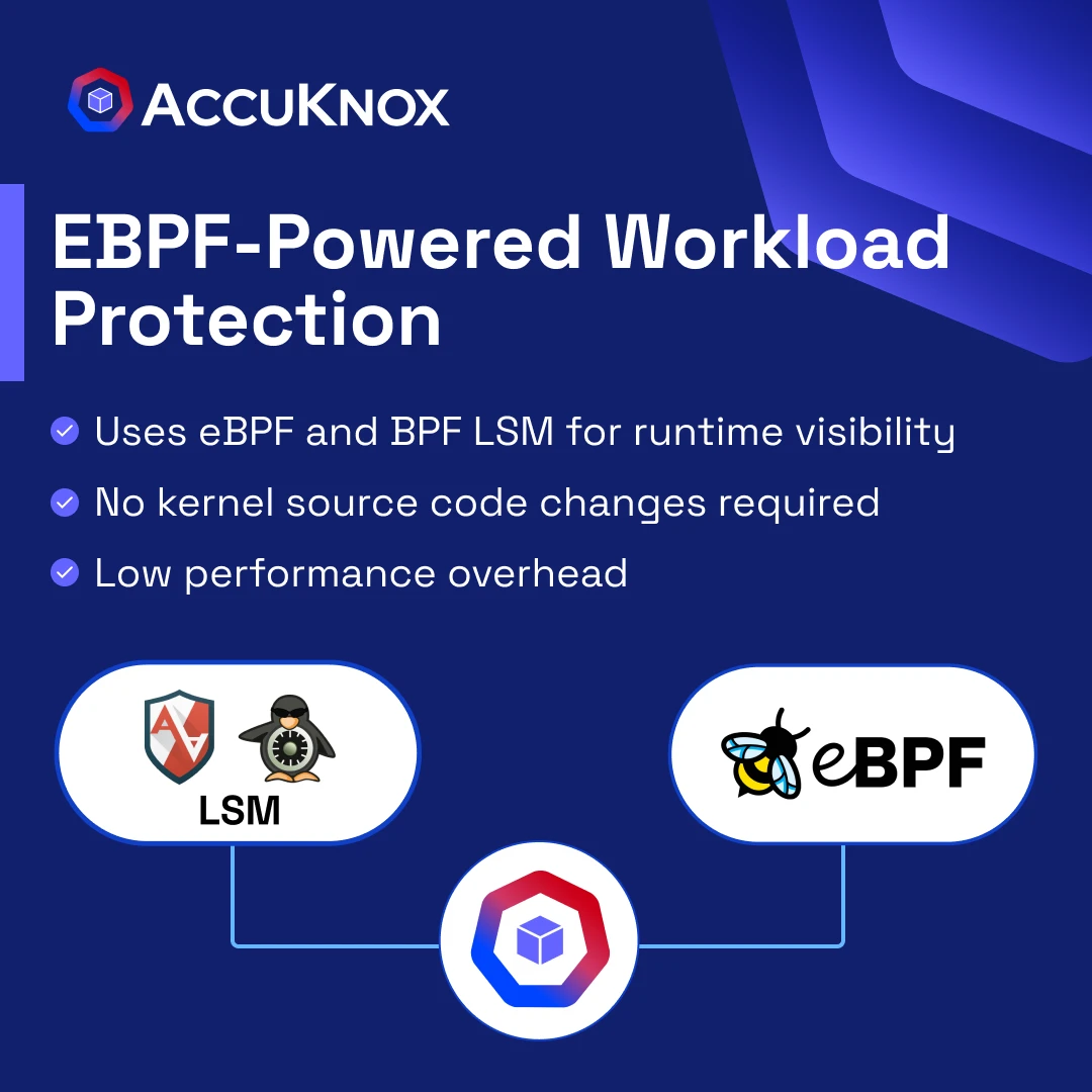 eBPF and BPF LSM in AccuKnox’s CWPP provides modern workload protection without requiring changes to kernel source code, offering enhanced security while maintaining a user-friendly interface