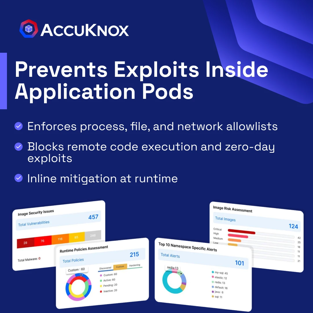 AccuKnox’s CWPP, leverages KubeArmor and prevents potential exploits, safeguarding against attackers who gain access to application pods and attempt remote code execution.