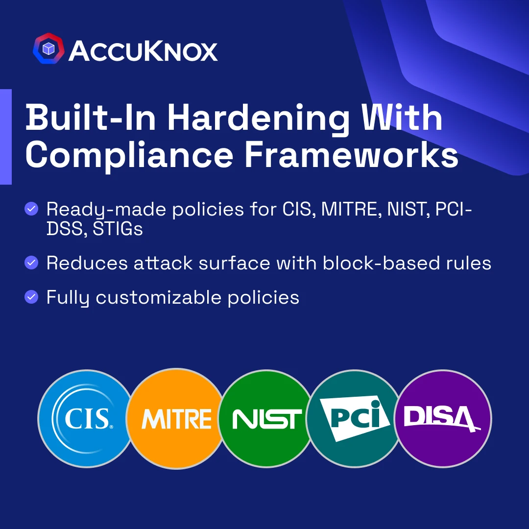 - Readymade hardening policies based on industry leading compliance frameworks like CIS, MITRE, NIST-800-53, and STIGs.